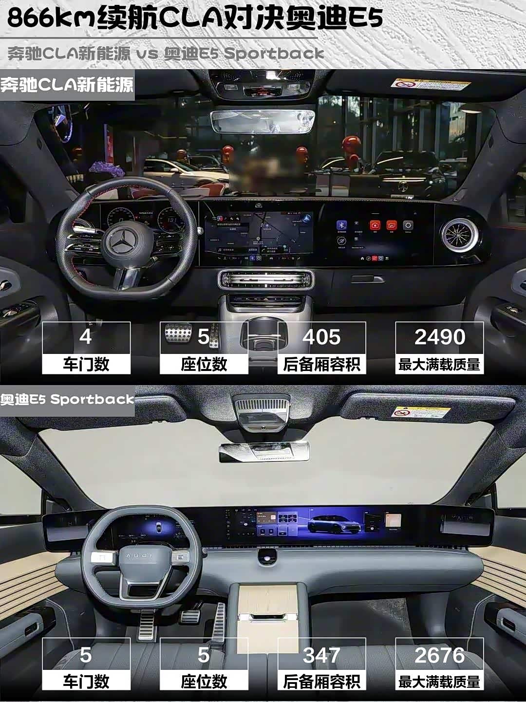 虽然CLA新能源轴距加长40mm,但后排还是略局促。奥迪E5后备箱347L能塞4个28寸箱,放倒秒变双人床!不过溜背造型牺牲了后排头部空间,1米8以上会扫头发。
