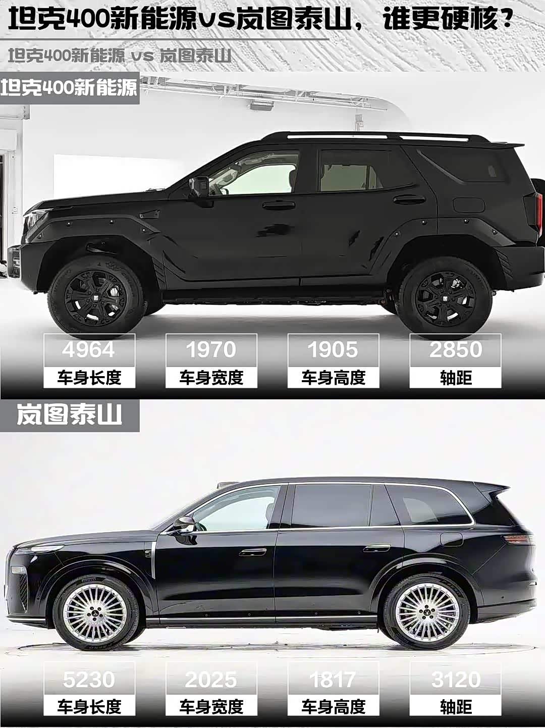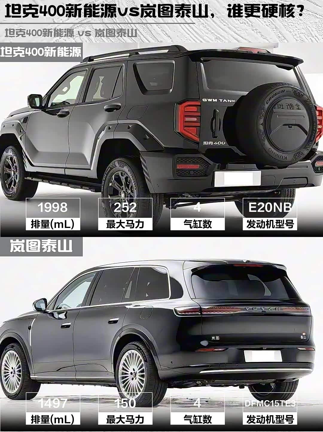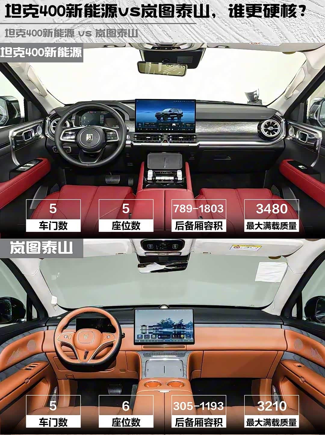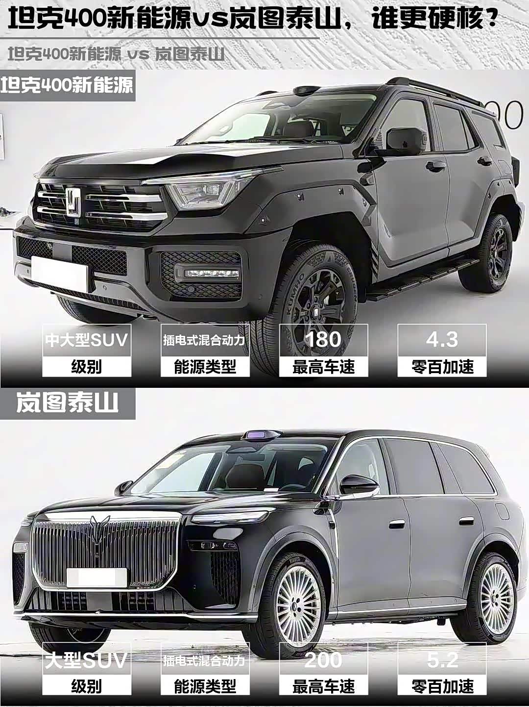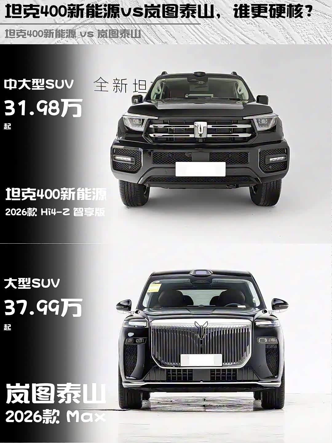 坦克400新能源31.98万 vs 岚图泰山37.99万,6万差价体现在哪?要极致越野选坦克,三把锁+改装潜力值回票价;要商务豪华选岚图,空悬+智驾配置越级。个人最爱坦克400的机甲造型+外放电,但家里领导更中意岚图的零重力座椅...你们会怎么选?