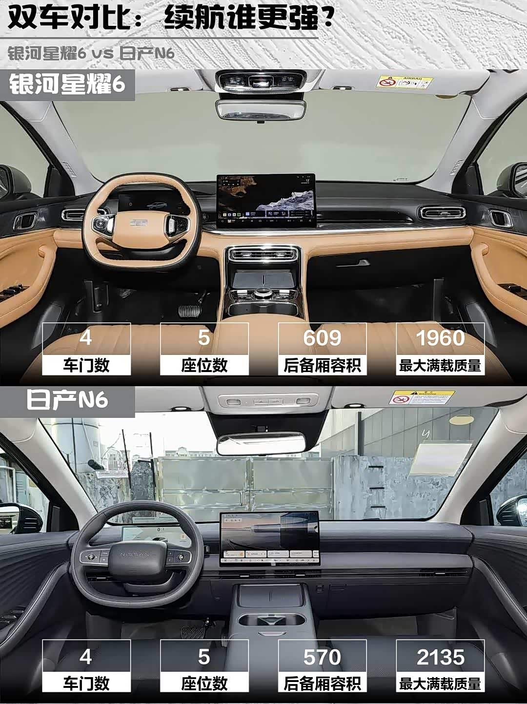 银河星耀6后备箱609L完胜N6的570L,后排膝部两拳余量,门板能塞1.5L水壶。N6后排更宽敞(695mm膝部空间),但后备箱不能放倒!银河前排放倒直接变身小货车,拉大件更灵活🛋️