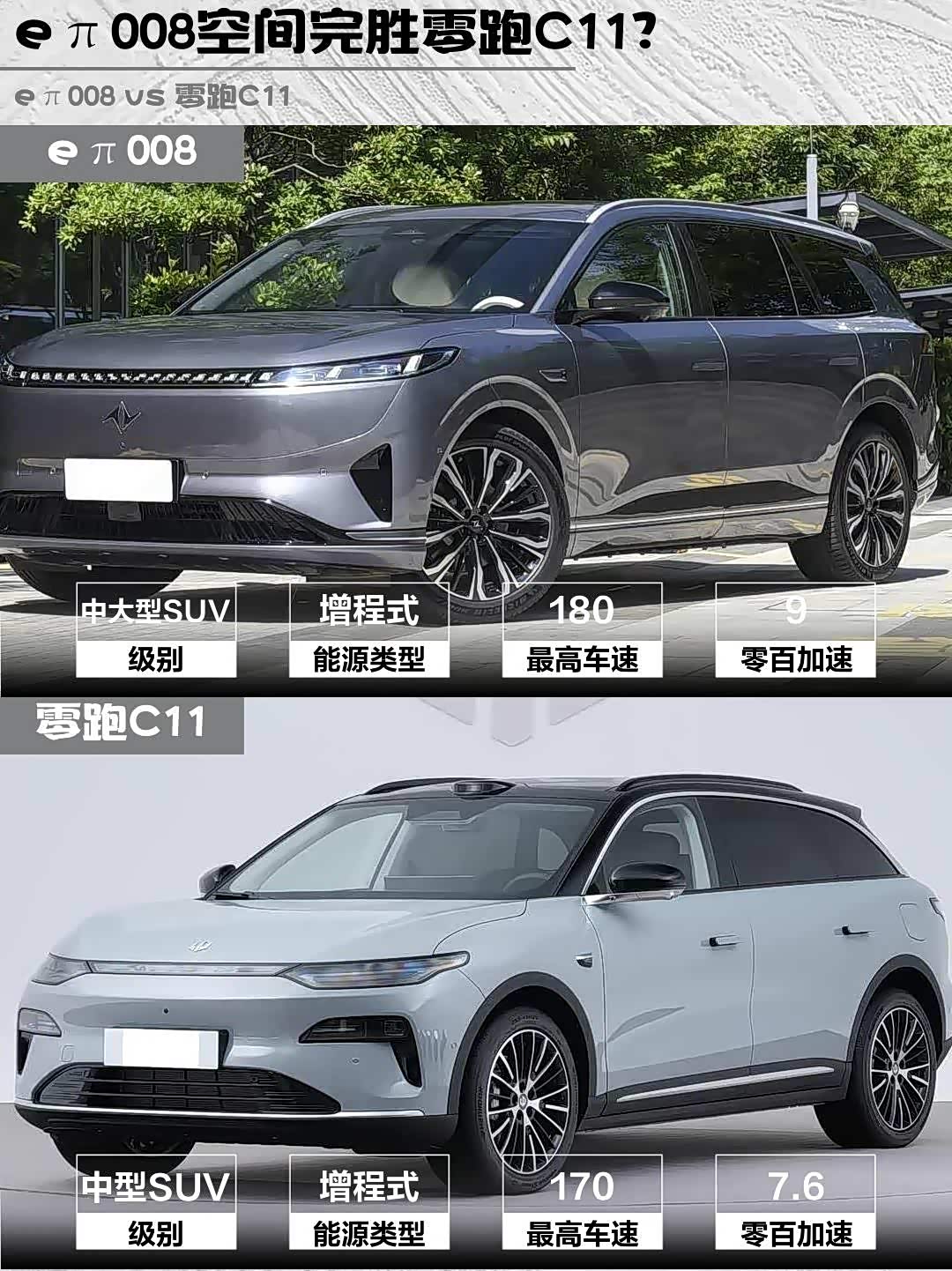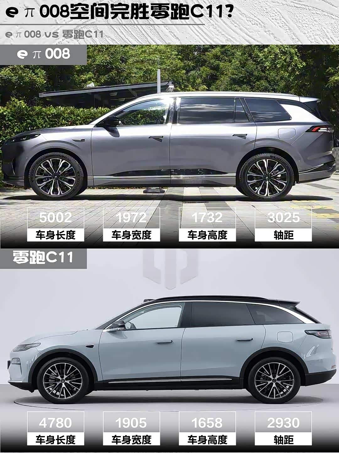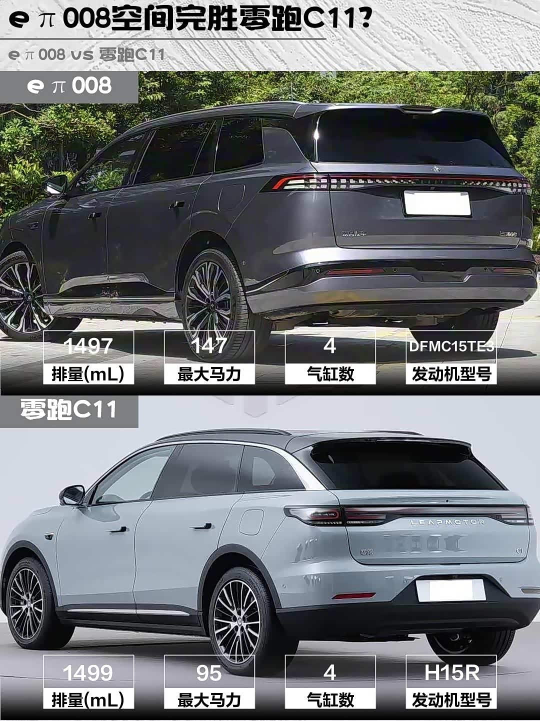 价格方面:eπ008指导价16.99万,零跑C11是15.98万,差价1万主要差在空间和舒适配置上。个人建议:如果经常全家出行,eπ008的大空间和冰箱小桌板更实用;要是更看重智能科技和续航,零跑C11的激光雷达+三联屏绝对能让你爽到。