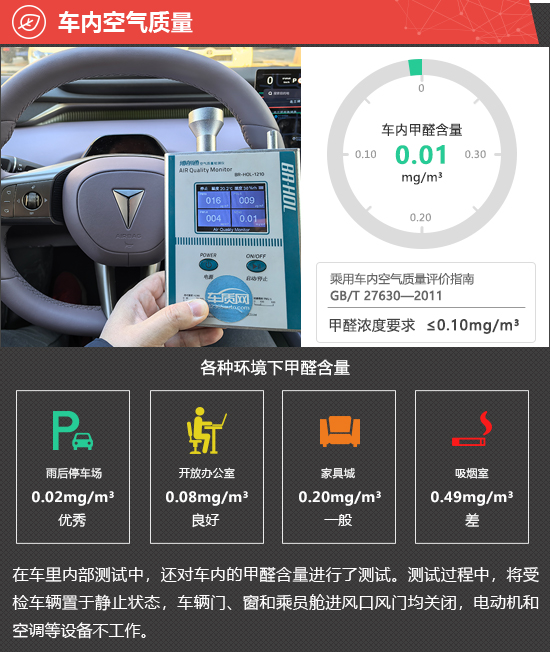 在车内空气质量测试环节,将车辆放置在车辆较少的内部地面停车场中,实测2026款深蓝L06的车内甲醛含量为0.01mg/m3,符合2012年3月1日起实施的,由原环保部和国家质量监督检验检疫总局联合发布的《乘用车内空气质量评价指南》(中华人民共和国国家标准GB/T 27630-2011)中的相关标准。