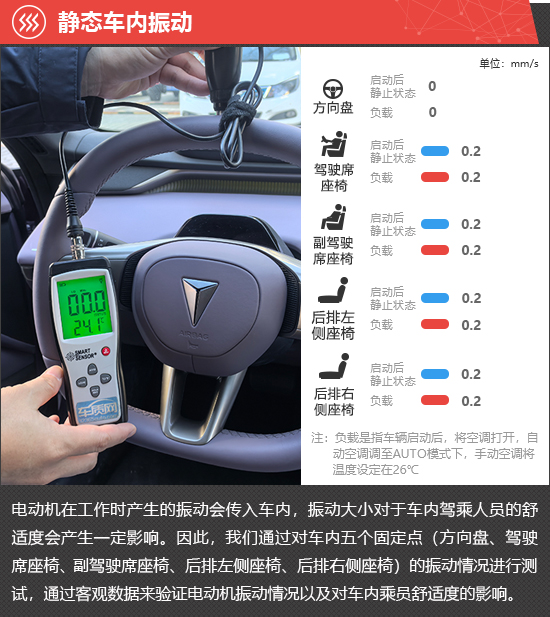 在静态车内振动测试环节,启动后静止和负载两种状态下,2026款深蓝L06方向盘位置的振动数值始终为0,前后排座椅的振动数值处于相对较低水平且保持不变,实际体感不明显。