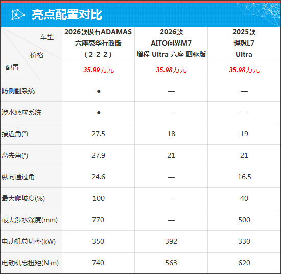 具体到车辆配置层面,通过对比来看,极石ADAMAS在越野能力上更胜一筹,不仅独享涉水感应系统,并且接近角、离去角、纵向通过角以及最大涉水深度等方面也都有着亮眼表现。此外,电动机总扭矩也占有优势,对于非铺装路面脱困更有利。相比之下,另外两款车型更偏向城市用车环境。