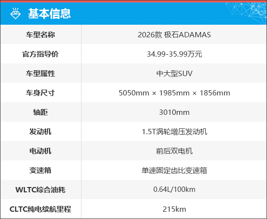 极石ADAMAS共推出2款车型,官方指导价34.99-35.99万元。新车搭载由1.5T发动机+双电机组成的增程系统,CLTC纯电续航里程为215km。