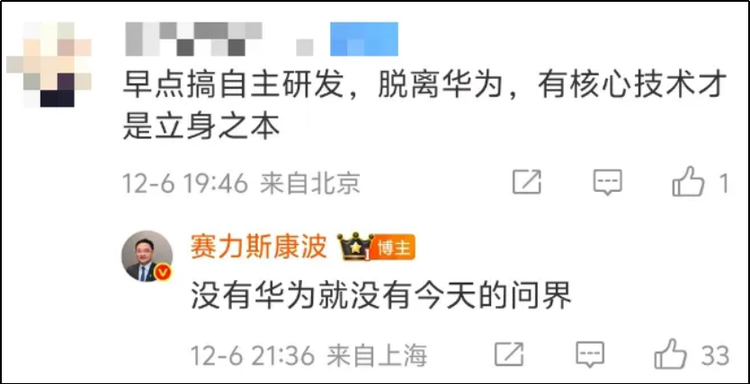 此前,也有网友在赛力斯副总裁康波的微博下留言,建议“赛力斯早点搞自主研发,摆脱华为”。康波回应得干脆利落:“没有华为,就没有今天的问界。”