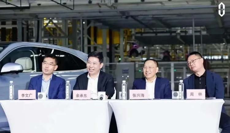 在100万辆下线仪式上,赛力斯董事长张兴海将问界的快速成长归功于跨界融合新模式,其中一页PPT写道:“深深感谢华为,问界是华为鸿蒙智行坚定的战略合作伙伴”。