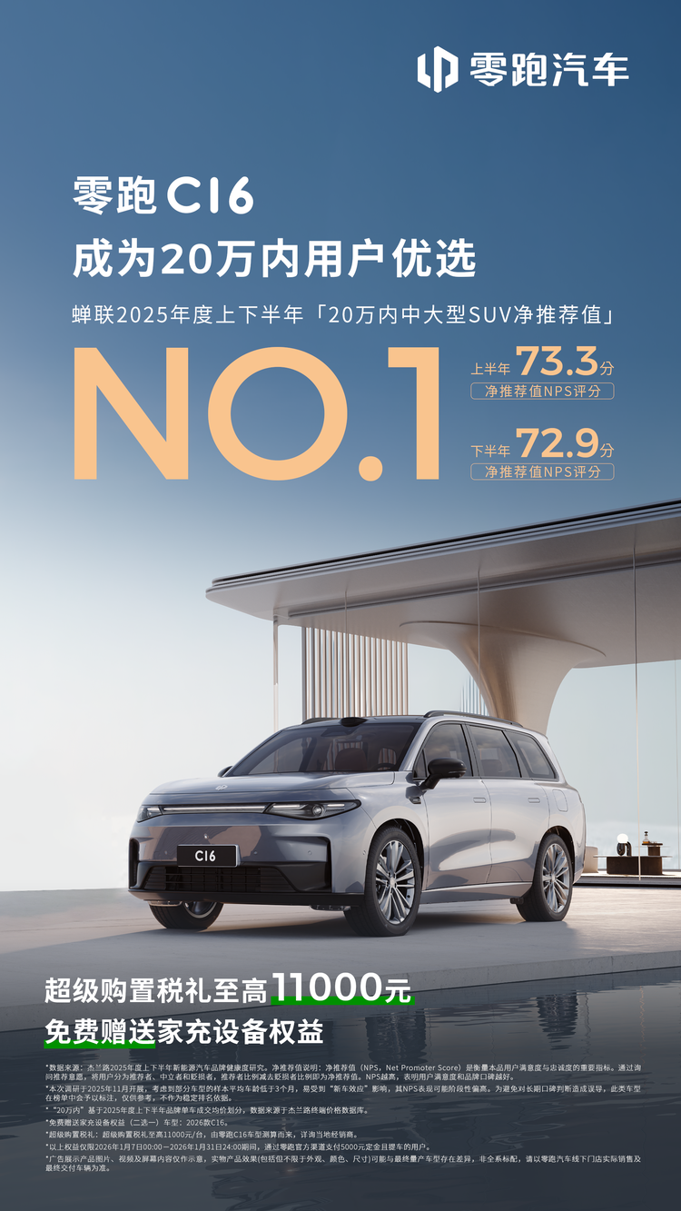 此外,根据杰兰路2025年度新能源汽车品牌健康度研究(调研于2025年11月开展),零跑C16的净推荐值(NPS)处于行业前列。净推荐值(NPS)是衡量用户满意度和忠诚度的重要指标,较高的NPS通常反映出更积极的用户口碑与产品认可度。