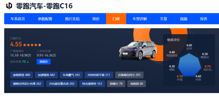 判断一款车型的优劣,消费者的反馈最具参考价值。根据权威媒体的同级车型数据对比,零跑C16在同级别竞品中的口碑评分位居前列。无论是外观、内饰、动力、配置、空间、操控还是舒适性,各项均获得4分以上(满分5分)的评价,整体表现达到优秀水平。相比之下,银河M9虽然同样获评优秀,但综合评分仍稍逊于零跑C16。在驾控体验上,零跑C16凭借后驱布局、三种驾驶模式及可变悬架的搭配,在操控质感与驾驶乐趣方面也比银河M9更具优势。