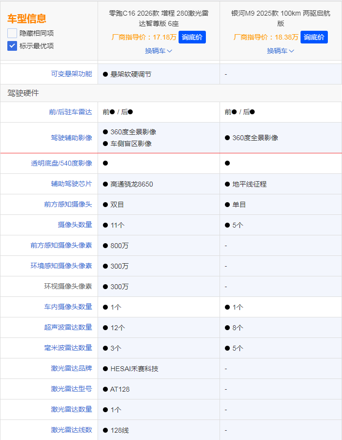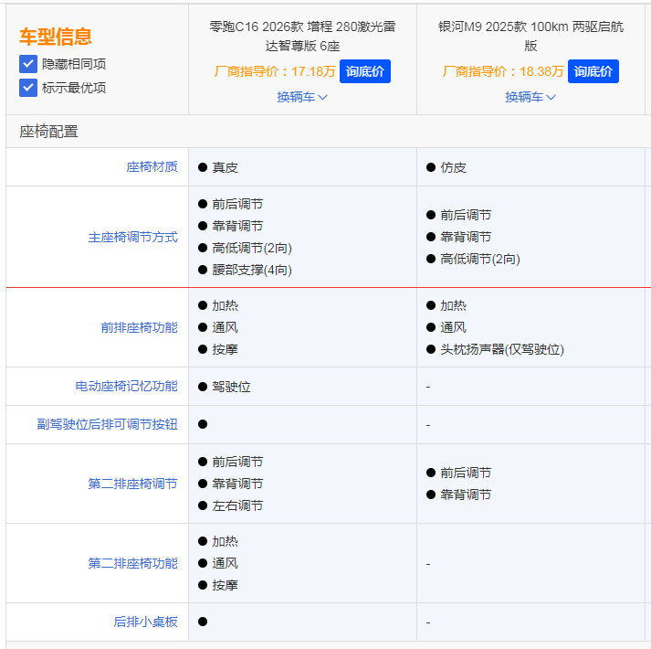 今天我们就以这个细分市场中备受关注的两款车型—— 零跑C16(参数|询价)增程激光雷达智尊版(顶配)和吉利银河M9 两驱启航版(低配)为例,从实际落地价格切入,结合核心配置表现做深度对比,为大家的购车决策提供一份真实、靠谱的参考。
