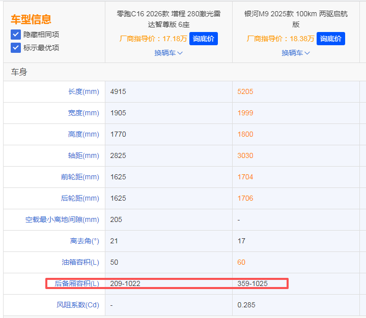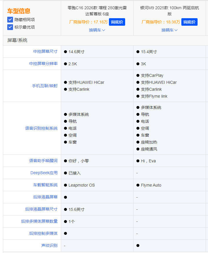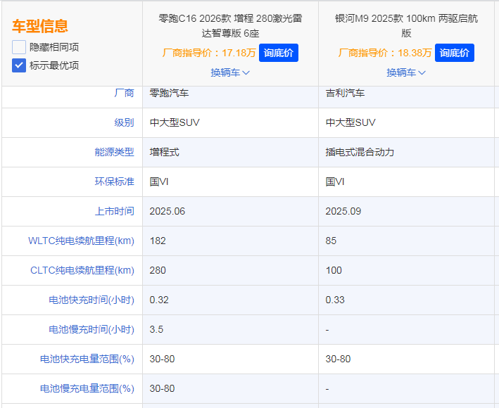 零跑C16 2026款增程280激光雷达智尊版指导价为17.18万元,吉利银河M9 2025款100km两驱启航版为18.38万元。在20万预算内,零跑C16提供纯电与增程、5座与6座等多种选择,其增程6座版价格区间在15.18万至17.18万元。而银河M9若想获得更多配置,则需要相应提高预算。因此在相近预算(20万以内)下,用户可能面临“顶配”与“入门”之间的考量。