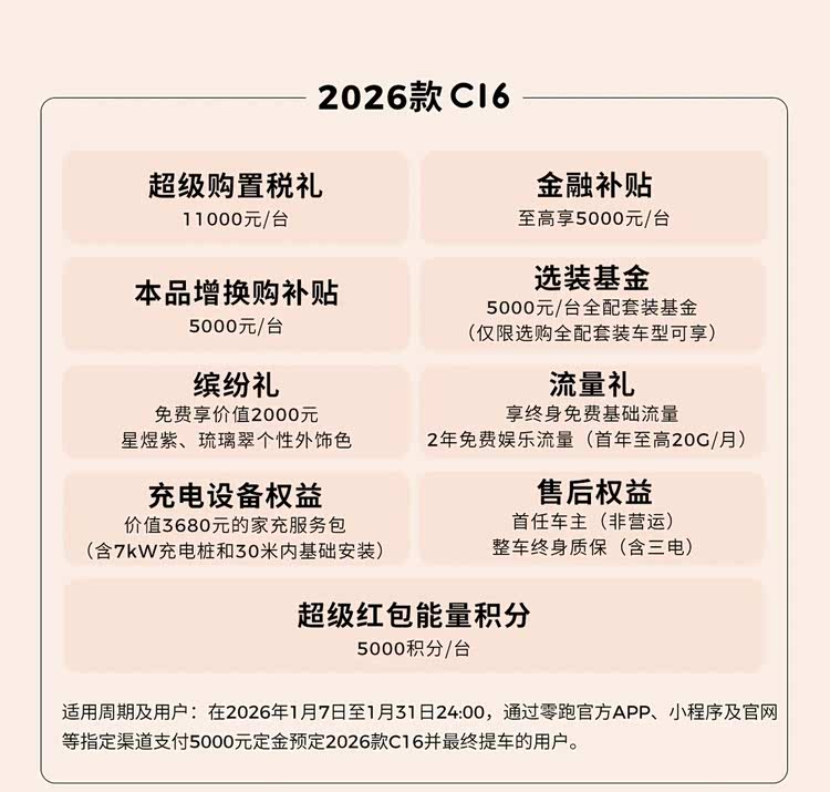 2026年1月7日至1月31日24:00期间,通过零跑官方APP、小程序或官网等指定渠道支付5000元定金预订2026款C16并最终完成提车的用户,即可享受厂家提供的多项购车礼遇,具体权益如下表所示。