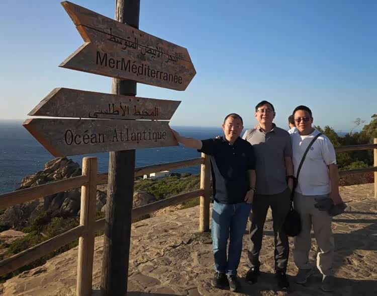 2025年9月16日,站在丹吉尔的斯帕特尔角——非洲大陆最西北端、直布罗陀海峡西端入口处,轩辕考察团亲眼见到了大西洋与地中海的自然分界线。那里立着一块用阿拉伯语和法语标注的木牌,标示以西为大西洋、往东是地中海、向北则是西班牙的特拉法尔角。