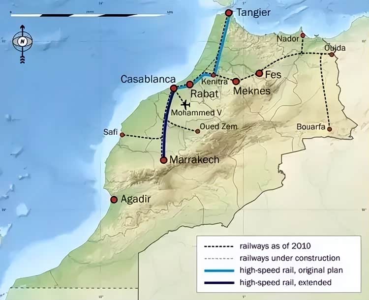 摩洛哥计划到2035年建成1500公里高铁网络,成为非洲高铁网络的标杆;预计到2040年,铁路将覆盖全国87%的人口。