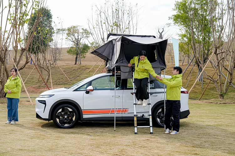 与此同时,车内座椅可放平形成2.5米纯平大床,与车顶帐篷组成“双层休憩空间”,轻松满足4—5人露营住在车上的需求。再加上遮阳帘、内置三个充电口等实用配置,进一步提升了露营场景的实用性与舒适度。