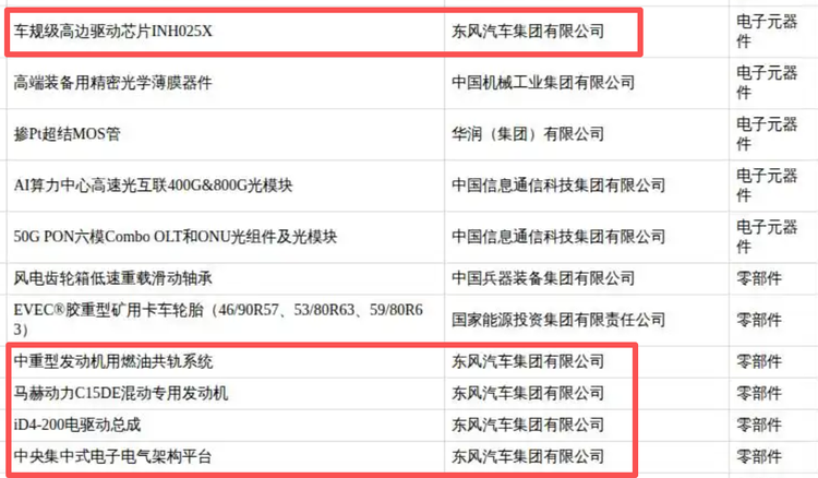 近日,国务院国资委为加速中央企业科技创新成果的推广与应用,正式发布了《中央企业科技创新成果推荐目录成果手册(2024年版)》,收录电子元器件、零部件、新材料、仪器仪表等7个领域263项科技创新成果。东风汽车集团有限公司(以下简称东风汽车)自主研发的“车规级高边驱动芯片INH025X”“中重型发动机用燃油共轨系统”“马赫动力 C15DE 混动专用发动机”“iD4-200 电驱动总成”“中央集中式电子电气架构平台”“汽车电子制动系统应用层软件”六项科技创新成果入选该手册,成为了东风汽车近年来坚持科技自立自强,在关键核心技术领域取得系统性突破的生动写照。