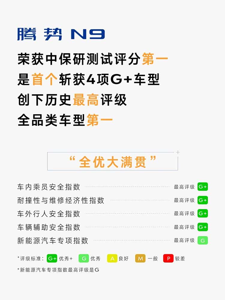 腾势N9在车内乘员安全指数、耐撞性与维修经济性指数、车外行人安全指数、车辆辅助安全指数四大核心分指数中均斩获最高等级G+评级,新能源汽车专项指数获G评级,全维度卓越安全成绩。在中国保险汽车安全指数C-IASI测试成绩中,腾势N9实现全优大满贯!是名副其实的安全之王。