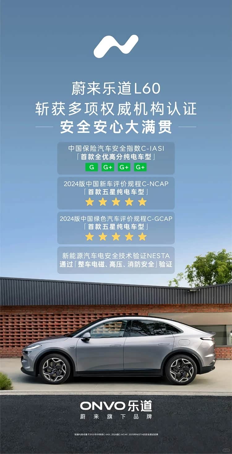 对任何车型来说,安全都是立身之本,乐道L60能成为家庭用户首选,离不开顶级的安全表现。它不仅是首款中保研全优高分纯电车型,还拿下C-NCAP与C-GCAP双五星认证,包揽多项权威安全测试最高评级,安全实力拉满。