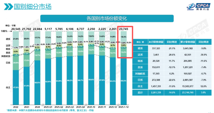乘联分会数据显示,韩系品牌的市场份额从2020年的3.8%,一路收缩至2025年的0.9%。与之形成鲜明对比的是,尽管同样承压,日系和德系品牌同期的市场份额仍分别保持在12.2%和15.4%左右。