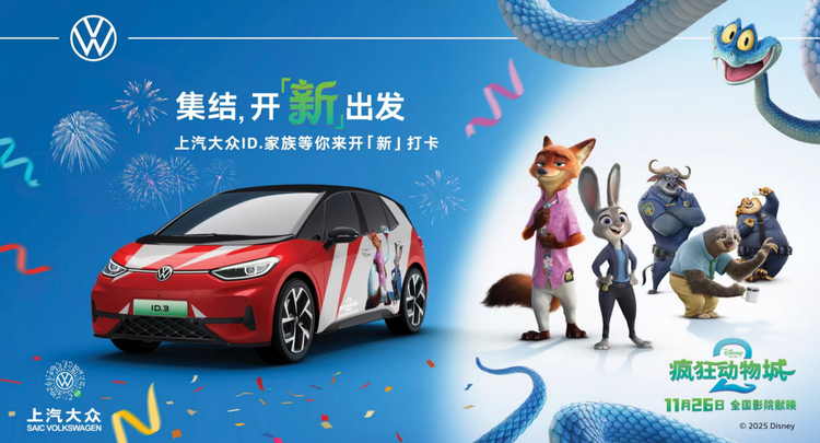 影视IP联动这块,上汽大众和《疯狂动物城2》的合作,堪称教科书级别。这次合作主要围绕ID.3 GTX车型展开,没有生硬地贴logo,而是把车型巧妙植入到电影里,线下还搞了主题展车巡展,从广州车展到机场、4S店,走到哪火到哪。线上还拍了定制短片,再搭配电影票抽奖、送限量周边的活动,一套组合拳下来,把IP流量稳稳转化成了品牌好感度。