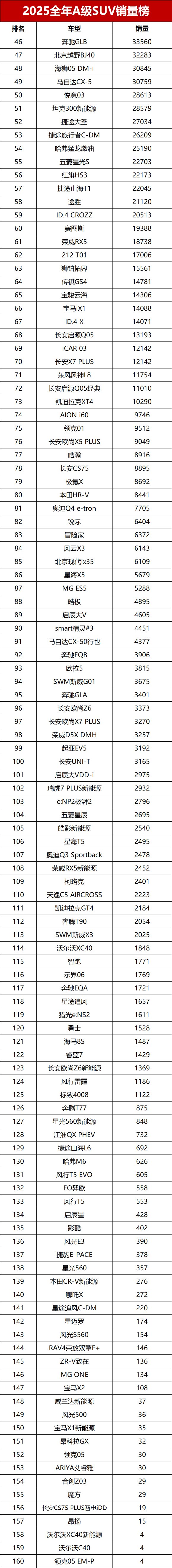 此外,豪华品牌和新晋车型也有不同表现。宝马X1以51656辆排名第35,成为豪华A级SUV销量冠军,奥迪Q3和奔驰GLB分别以34093辆和33560辆位列第45和46位,表现中规中矩。捷途旅行者、哈弗猛龙新能源等车型销量均突破6万辆,跻身前30位,成为市场新的增长点。而部分新能源车型如AION Y、零跑B10等,也凭借精准定位,稳居销量中游,逐步扩大市场影响力。