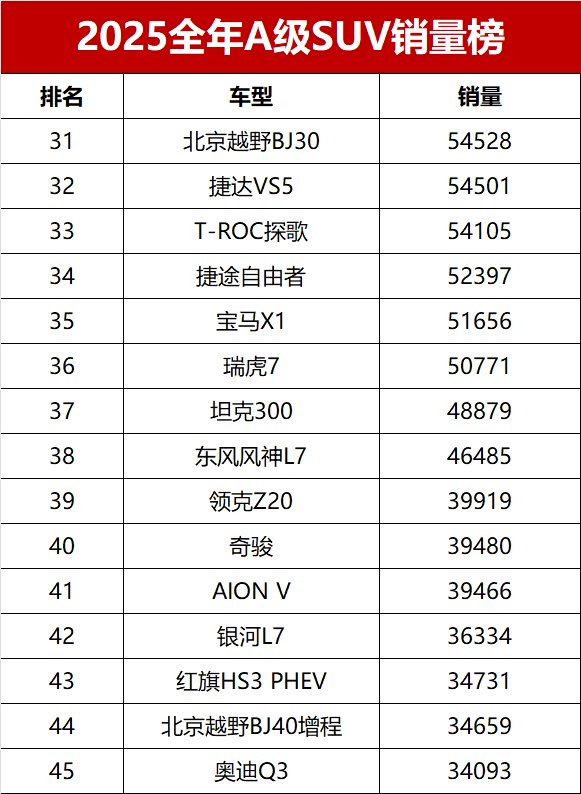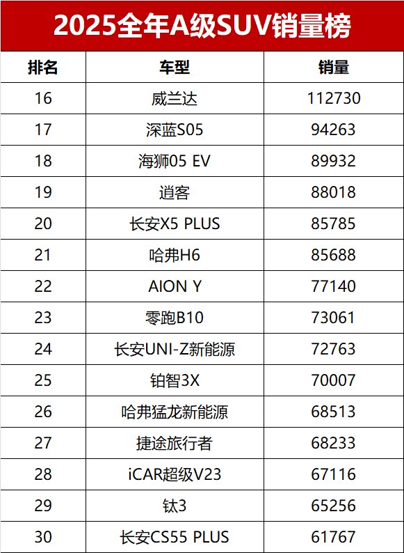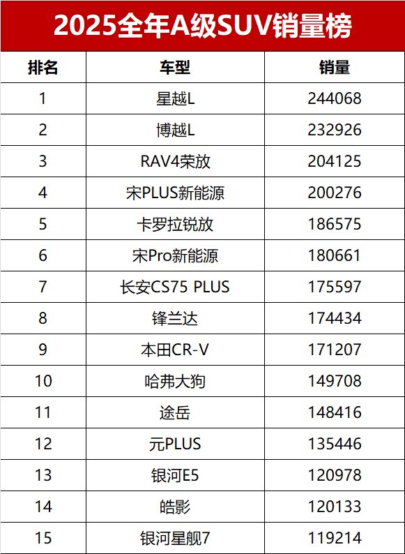 在新能源汽车全面渗透的大环境下,2025年国内A级SUV市场却走出了不一样的节奏。乘联会数据显示,全年A级SUV零售销量达638.4万辆,同比增长7.9%,不仅跑赢了SUV市场5.0%的整体增速,在乘用车市场的份额也稳至26.9%。值得注意的是,这个细分市场仍是传统燃油车的主场,新能源渗透率仅四成多,反映在榜单上,就是销量前十的车型中新能源车仅占两席。燃油车逆袭!2025全年A级SUV销量榜,吉利霸榜,比亚迪退出三强!