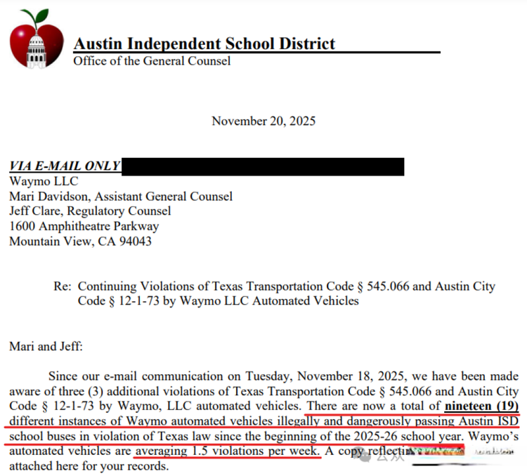 然而,事实证明此解决方案并不彻底。尽管Waymo已针对亚特兰大市的这一特定场景修复了技术漏洞,但其Robotaxi随后在得克萨斯州奥斯汀市,又多次被拍到非法超越停靠的校车。