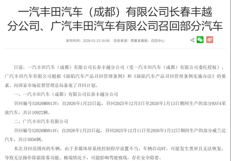 公开资料显示,1月23日一汽丰田汽车(成都)有限公司长春丰越分公司、广汽丰田汽车有限公司根据《缺陷汽车产品召回管理条例》和《缺陷汽车产品召回管理条例实施办法》相关要求,公开了召回计划。