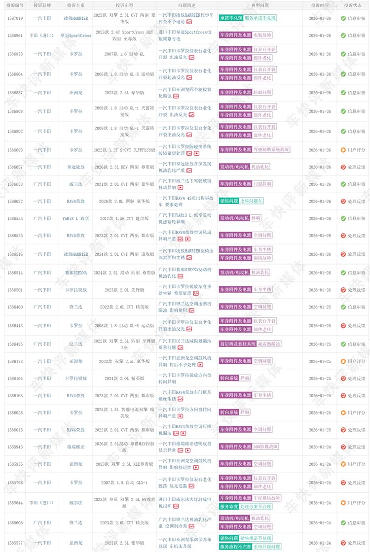 也就是说,在短短不到两个月的时间丰田在国内已经进行了两次大规模的召回。随着两次召回事件的发生,最近一段时间在汽车投诉平台上丰田的投诉量明显增多。这对于以可靠稳定性著称、被网友称为“一车传三代”的丰田品牌形象,或许是一个不小的负面影响。