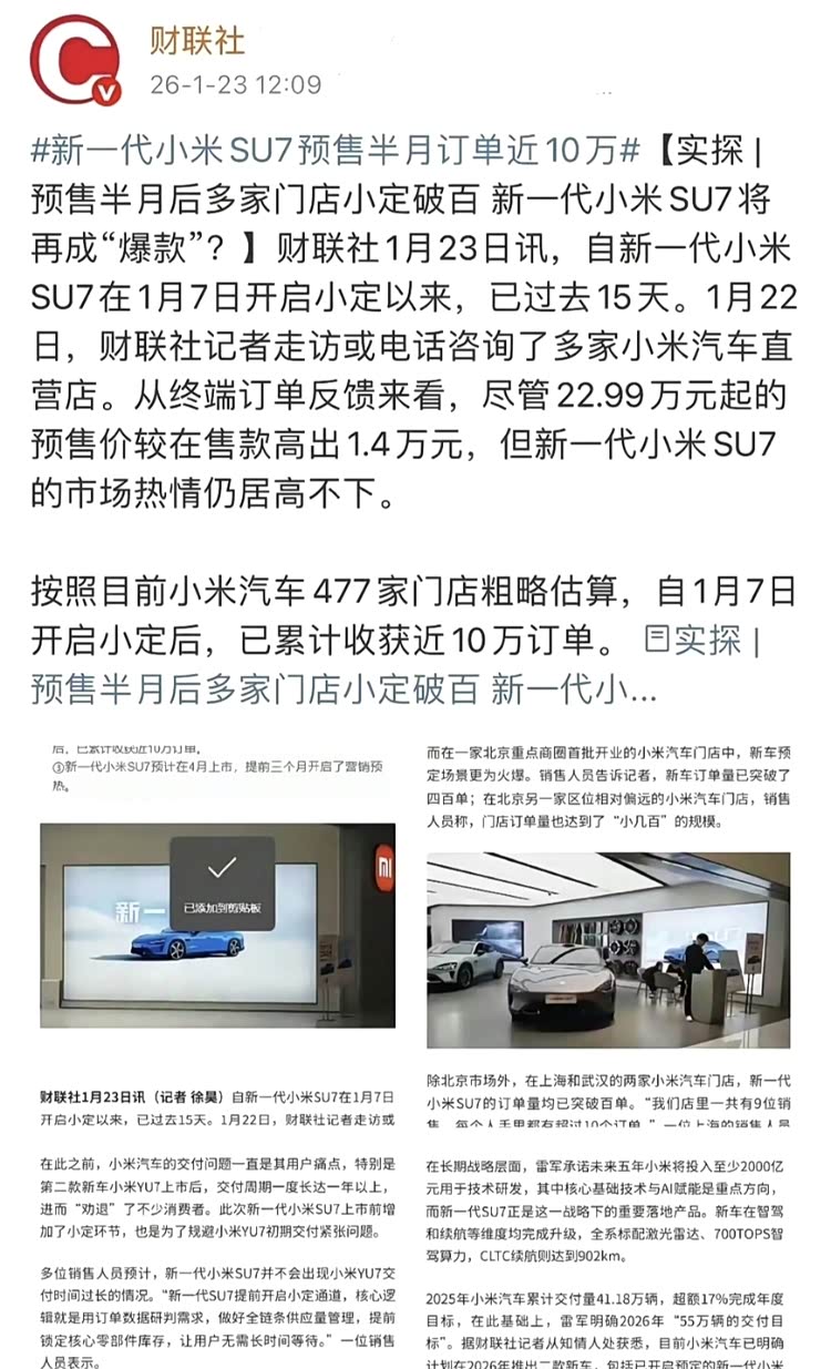 援引财联社的消息,预售半个多月的新一代su7,在多家门店的订单量全部突破100台,1月7日至今,累计小订突破10万台。根据了解,虽然全新SU7会涨价1.4万元左右,但市场热情并没有降低。