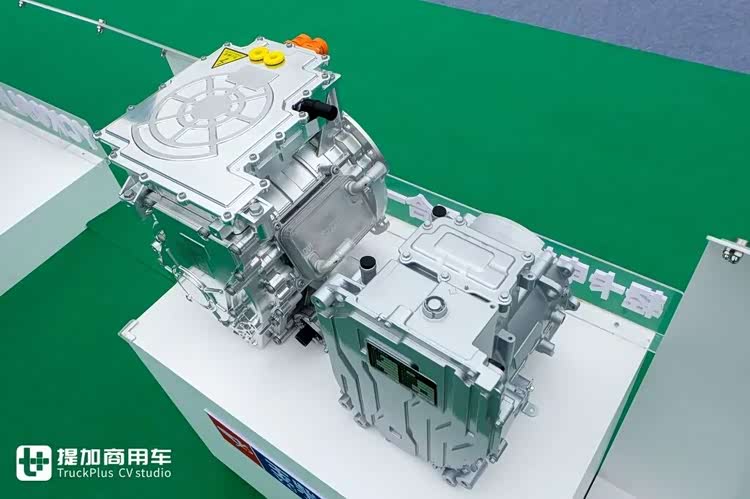 标载版重卡箱驱动力系统采用H-PIN高速扁线电机,整体重量较传统低转速电机轻90公斤以上。电机与减速器最高综合效率达95.7%,CHTC工况电耗低于竞品1%。该系统接口通用性强,可适配多数主流变速箱,为31–49T纯电商用车提供灵活、高效的动力解决方案,尤其适合标载物流运输场景。
