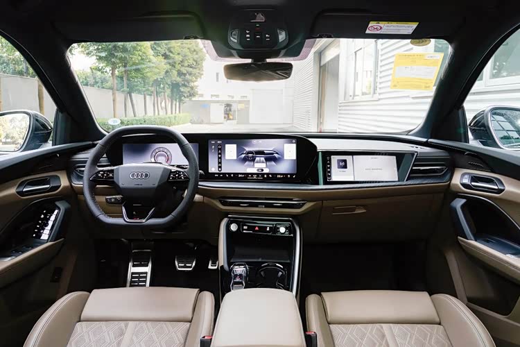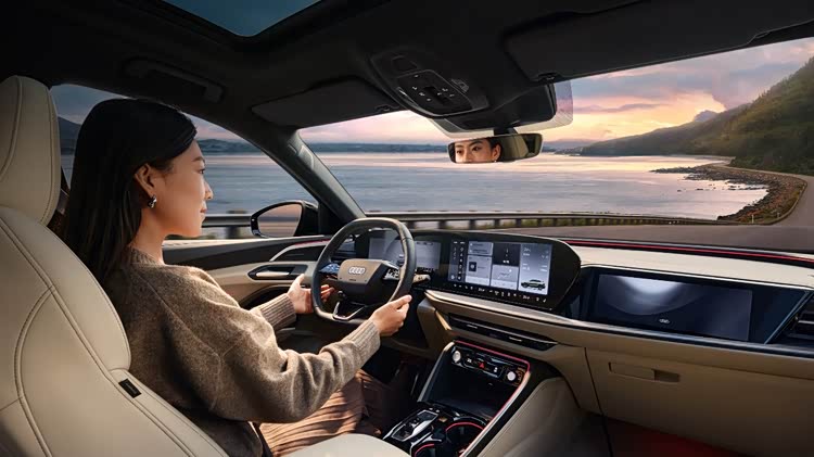 奥迪Q5L内饰采用家族最新设计,线条简洁、层次分明,以软性材质、真皮及金属饰条为主,豪华感符合同级别标准。全系标配11.9英寸仪表+14.5英寸OLED中控屏,内置全域生态系统,集成高德地图、爱奇艺、微信等应用,搭载骁龙芯片保障操作流畅性。智混旗舰型专属10.9英寸副驾娱乐屏,可选装13.1英寸W-HUD抬头显示,投射车速、导航等信息,提升驾驶安全性。座椅为真皮材质,主驾配备电动腰托,前排无线充电、双温区自动空调、30色氛围灯为全系标配,智混旗舰型搭载Bang&Olufsen音响系统(16枚扬声器),具备VNC噪声补偿功能,优化听觉体验。