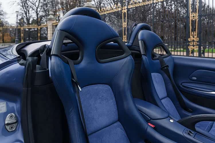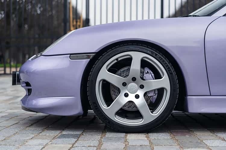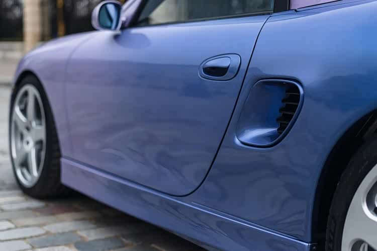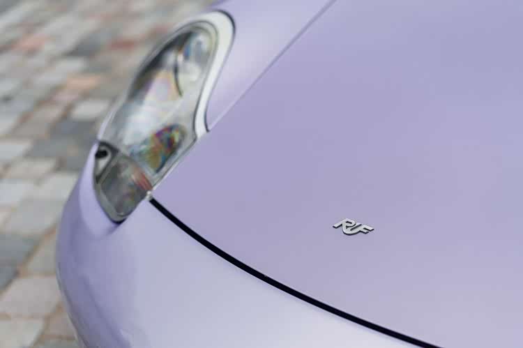 车头是淡雅的浅紫蛋白石色,向后逐渐过渡为深邃的安帕罗金属蓝,再配上同色系的淡紫色软顶,视觉效果堪称惊艳。这份“大胆到离谱”的配色方案,并非RUF的凭空想象,而是源于品牌与首任车主的深厚交情——车主希望用车身颜色,致敬自己钟爱的发色,于是RUF便为她量身打造了这套渐变涂装。这样充满“私人订制”温度的设计,在量产改装车里极为罕见,也让这台车的稀缺性再上一个台阶。