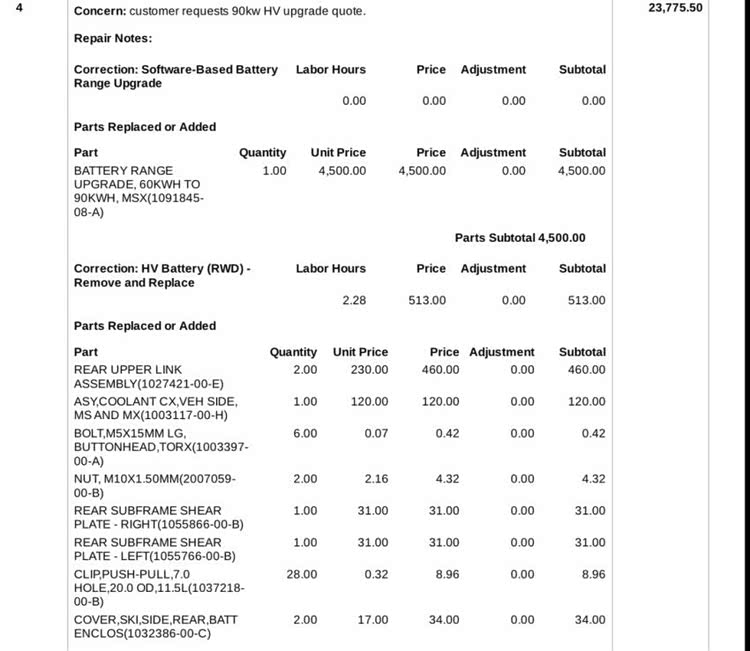 同时车主还咨询升级容量更大 90kWh 电池组的报价,原厂告知电池组本身价格 18,000 美元[注:1美元=7.1元],若要解锁全部容量再加上安装费与必要零件更换,车主升级电池的总费用将高达 23,262 美元[注:1美元=7.1元],惊人的价格引起 特斯拉 车主讨论。