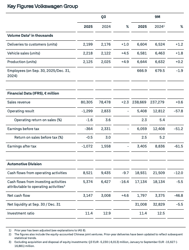 2025年三季度,大众汽车集团营收803.05亿欧元,同比微增2.3%,但净利润却由盈转亏,净亏损10.72亿欧元。