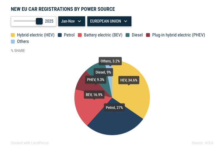 2022年,纯电动车在欧盟新车注册量中的占比为12.1%,到2025年11月,这个数字仅仅上升为16.9%。和飞速发展的中国市场比起来,简直高下立判。
