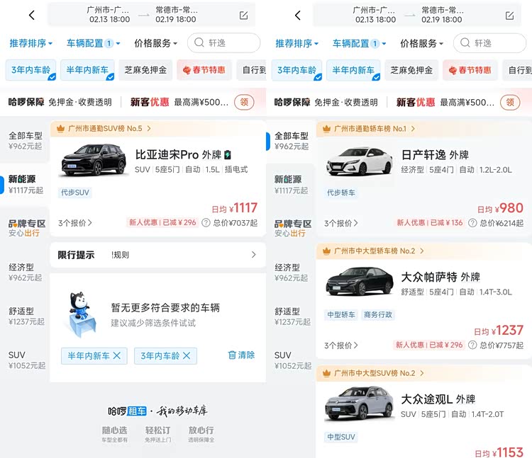 接下来我们以在“广东广州租一辆车回湖南常德,2月13日取、2月14日还”为例,看看三个自营平台的价格和服务有何不同。