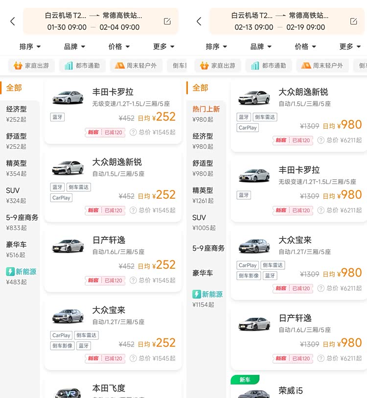 价格方面,经济型、舒适型及新能源车日均起步价均在900-1000元范围内,实测下来较非高峰期溢价明显,这也是市场供需关系的必然结果。而且,如果你有装年货的需求,选择租SUV的话,日均起步价直接破千,钱包瞬间就不淡定了。