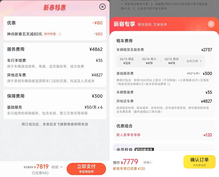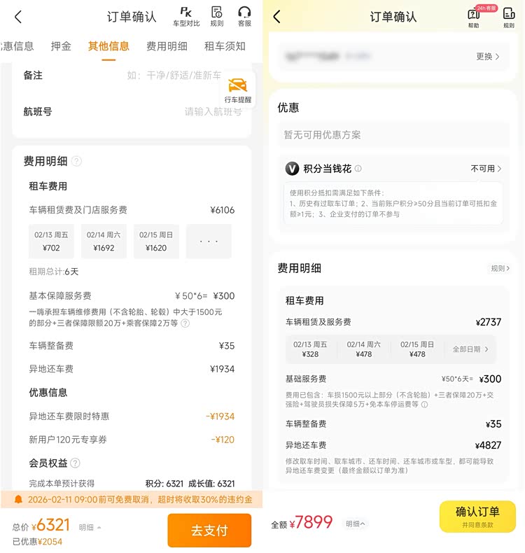 神州租车这笔费用高达4827元,占了总价的大头;而一嗨租车目前还提供免收异地还车费的限时优惠。更离谱的是,神州租车的这笔费用是“一口价”——哪怕你只租一天,这4827元也一分不能少。