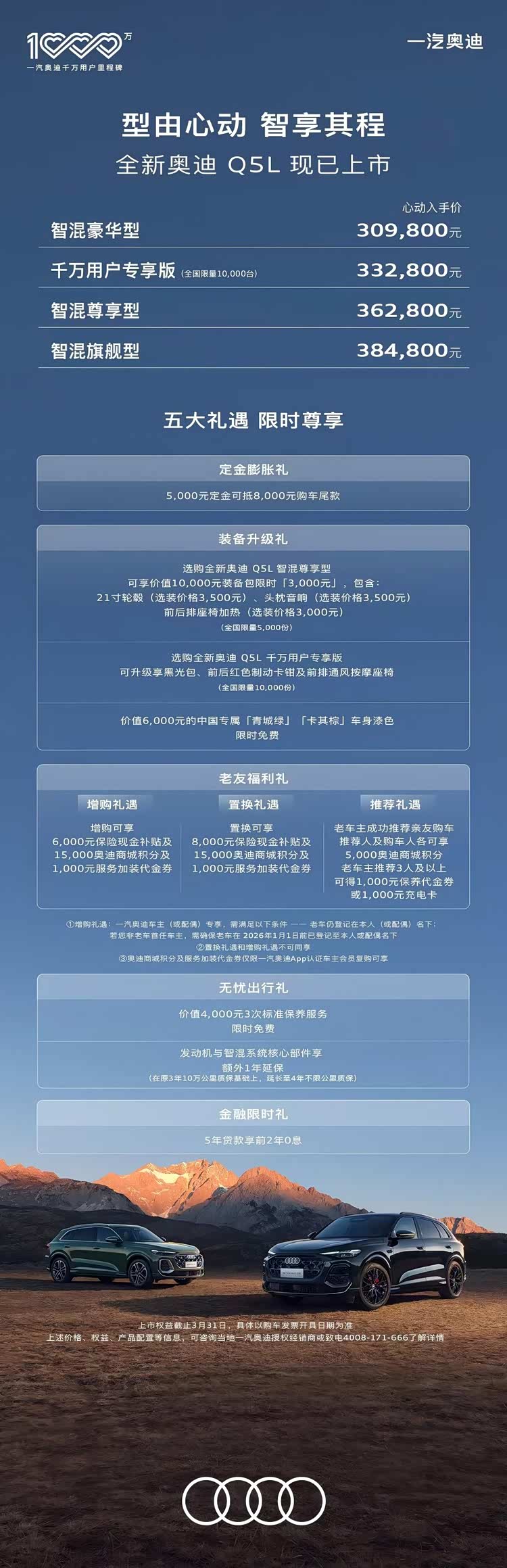 此次上市,全新奥迪Q5L带来五大限时尊享礼遇,叠加千万用户专属权益,诚意十足。新车权益方面,5000元定金可抵8000元购车尾款;智混尊享型3000元即可升级价值10000元装备包,含21寸轮毂、头枕音响、前后排座椅加热,全国限量5000份;千万用户专享版升级黑光包、红色制动卡钳及前排通风按摩座椅,全国限10000份;中国专属"青城绿""卡其棕"车身漆色限时免费。老友福利中,增购享6000元保险现金补贴+15000奥迪商城积分+1000元服务加装代金券,置换补贴提升至8000元;老车主推荐亲友购车,双方各得5000奥迪商城积分,推荐3人及以上额外获1000元保养代金券或1000元充电卡。无忧出行礼包含4000元3次标准保养服务,发动机与智混系统核心部件额外享1年延保;金融限时礼提供5年贷款前2年0息政策,所有上市权益有效期截至2026年3月31日。
