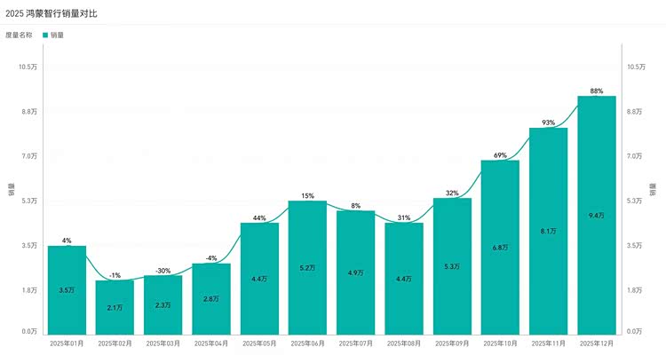 2025年是鸿蒙智行五界品牌聚合后的关键发展年,也是其开疆拓土的重要一年。从年初的市场发力,到年末的持续冲高,鸿蒙智行的单月销量始终保持上扬态势,多次刷新自身交付纪录。最终全年交出累计交付589107台的成绩单,同比增长32%,12月单月交付89611台,连续第三个月刷新月度交付纪录,在车市价格战与智能化内卷的双重压力下实现逆势突围。更值得关注的是,鸿蒙智行仅用43个月便完成累计100万辆的交付,较行业平均速度快近20个月,全系车型成交均价稳定在39万元,远超BBA等传统豪华品牌,在销量攀升的同时实现了品牌价值的同步提升。