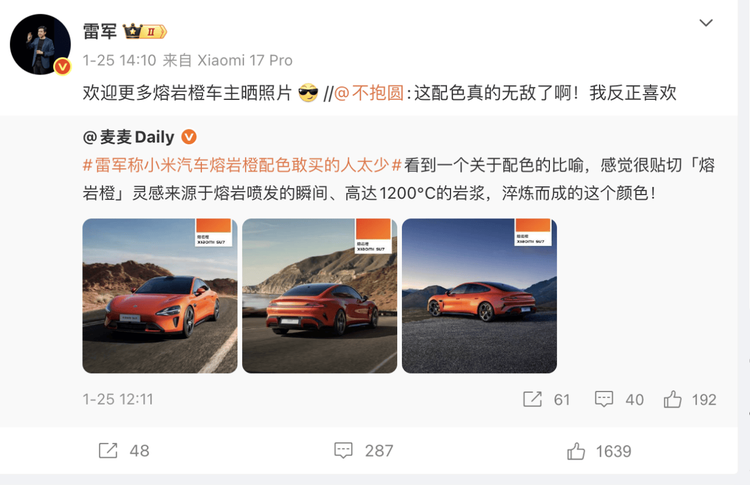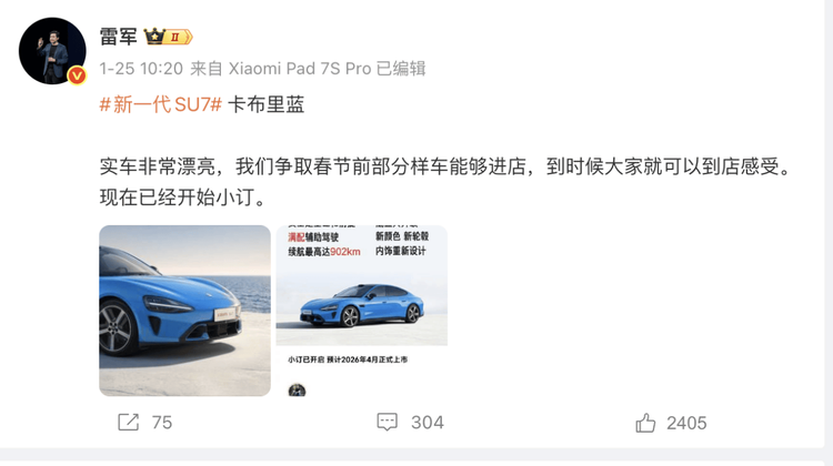 1月25日,雷军在微博中表示,小米SU7的卡布里蓝配色“实车非常漂亮”,争取春节前部分样车能够进店。而之前少有人购买的“熔岩橙”则宣布退市。
