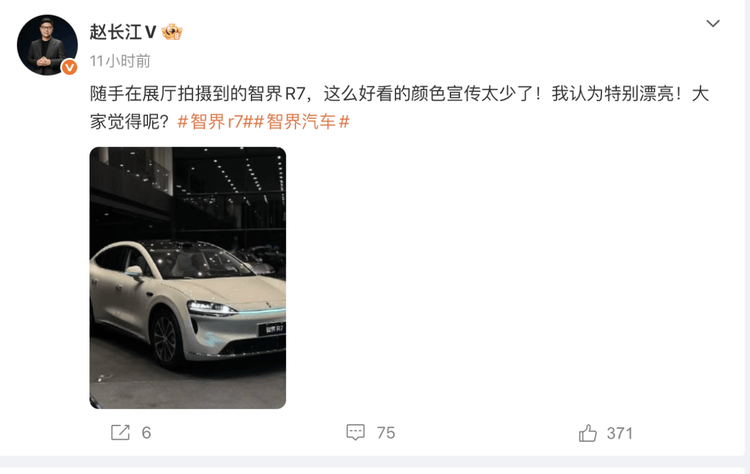 无独有偶,刚刚在微博上刷到, 智界R7(参数|询价)执行董事赵长江对配色“宣传不足”表示感慨,称“这么好看的颜色宣传太少了”。