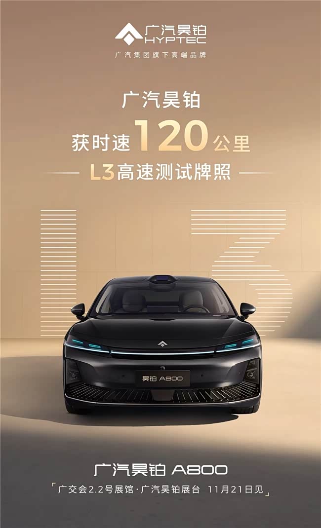 11月21日,搭载L3级自动驾驶技术的广汽昊铂A800,将登陆广州车展2.2馆,敬请期待!