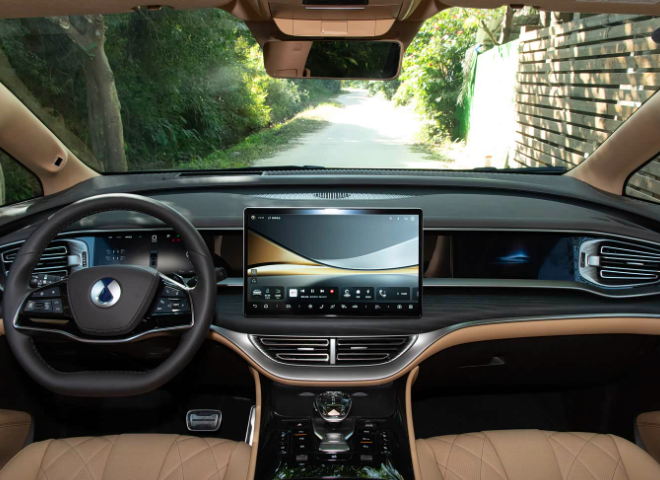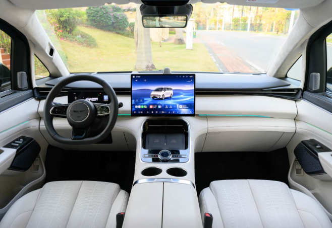 银河V900车内几乎被屏幕覆盖,10.25英寸仪表、15.4英寸中控屏、19.8英寸AR-HUD及17.3英寸后排吸顶屏,构成强大的视觉矩阵。核心搭载Flyme Auto 2.0系统与高通骁龙8295P芯片,并集成星睿AI大模型,硬件规格拉满。其亮点在于试图通过多屏联动与AI能力,打造一个高度集成、娱乐性强的智能空间。智能驾驶辅助方面,银河V900采用千里浩瀚H5方案,配备包括激光雷达在内的27个感知单元,支持无图城市NOA,展现了激进的未来出行愿景。