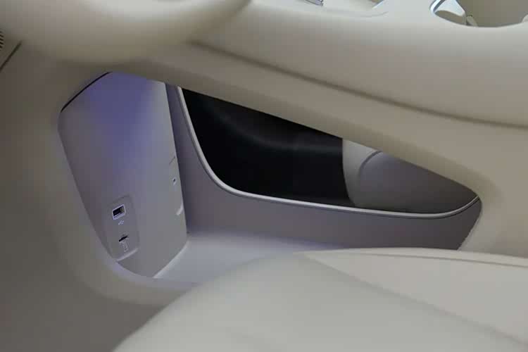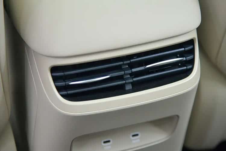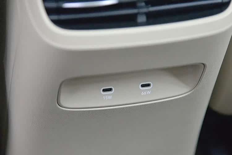 这辆车的轴距超过了2.85米,所以后排腿部空间相当不错。后排配有独立的空调出风口,下方配有两个Type-C充电口,其中一个支持66W快充,外接华为笔记本都不成问题。