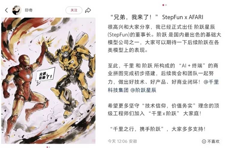 如果说入主千里是印奇在"终端"侧的布局,那么出任阶跃星辰董事长,则补上了"AI大脑"这一关键拼图。
