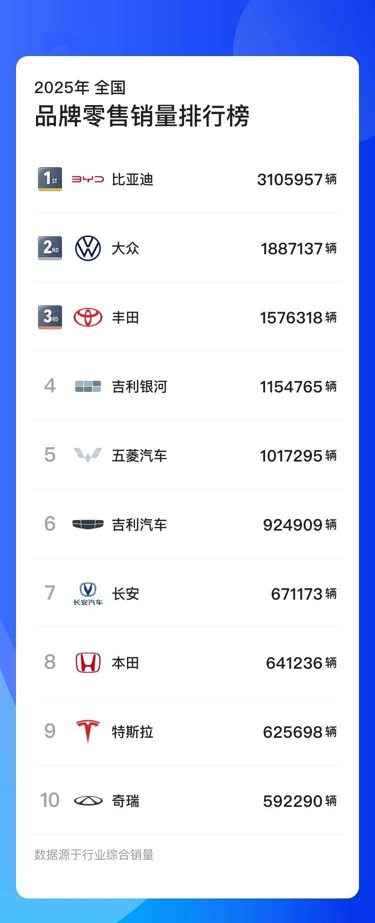 比亚迪领跑!2025年汽车品牌销量排名出炉