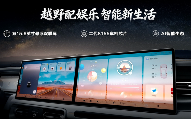 车内,北京越野BJ40增程悦野飞行版提供10.25英寸液晶仪表盘、双12.8英寸中控屏/副驾屏、启动按键屏、高通骁龙8155车机芯片等。
