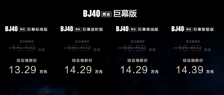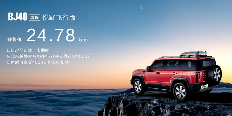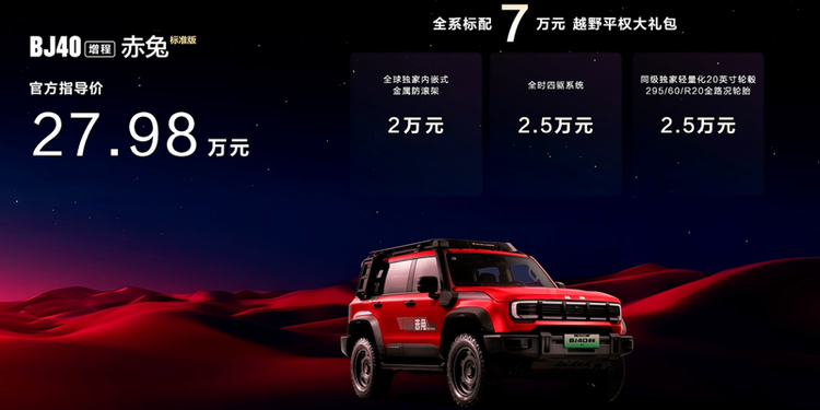 1月27日,新款BJ40/ BJ40(参数|询价)新增车型上市,其中BJ40增程赤兔版售价为27.98万元,2026款BJ40共推出4款车型,售价区间为15.59-16.69万元,综合焕新价13.29-14.39万元。BJ40增程悦野飞行版预售价为24.78万元。