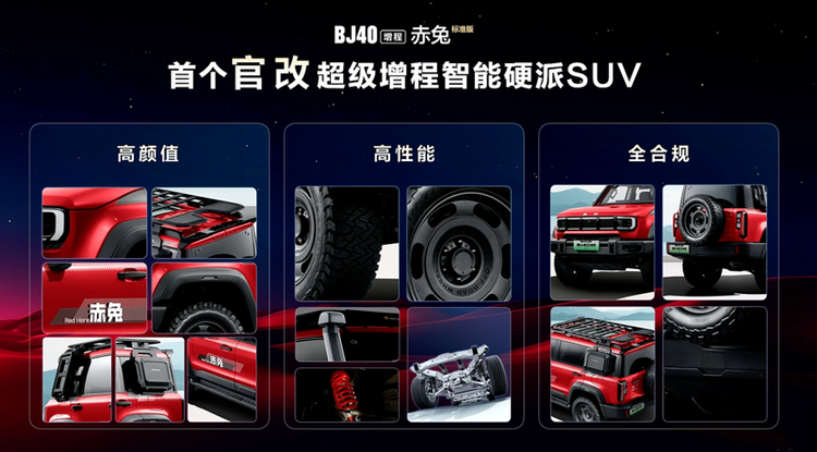 在原厂改装套件方面,BJ40增程赤兔版将提供专属前、后保险杠、扩充版轮眉、双向可调氮气减震、侧爬梯、侧书包、车顶平台、高进气量涉水喉、赤兔双耳扰流板以及专属车身拉花等。